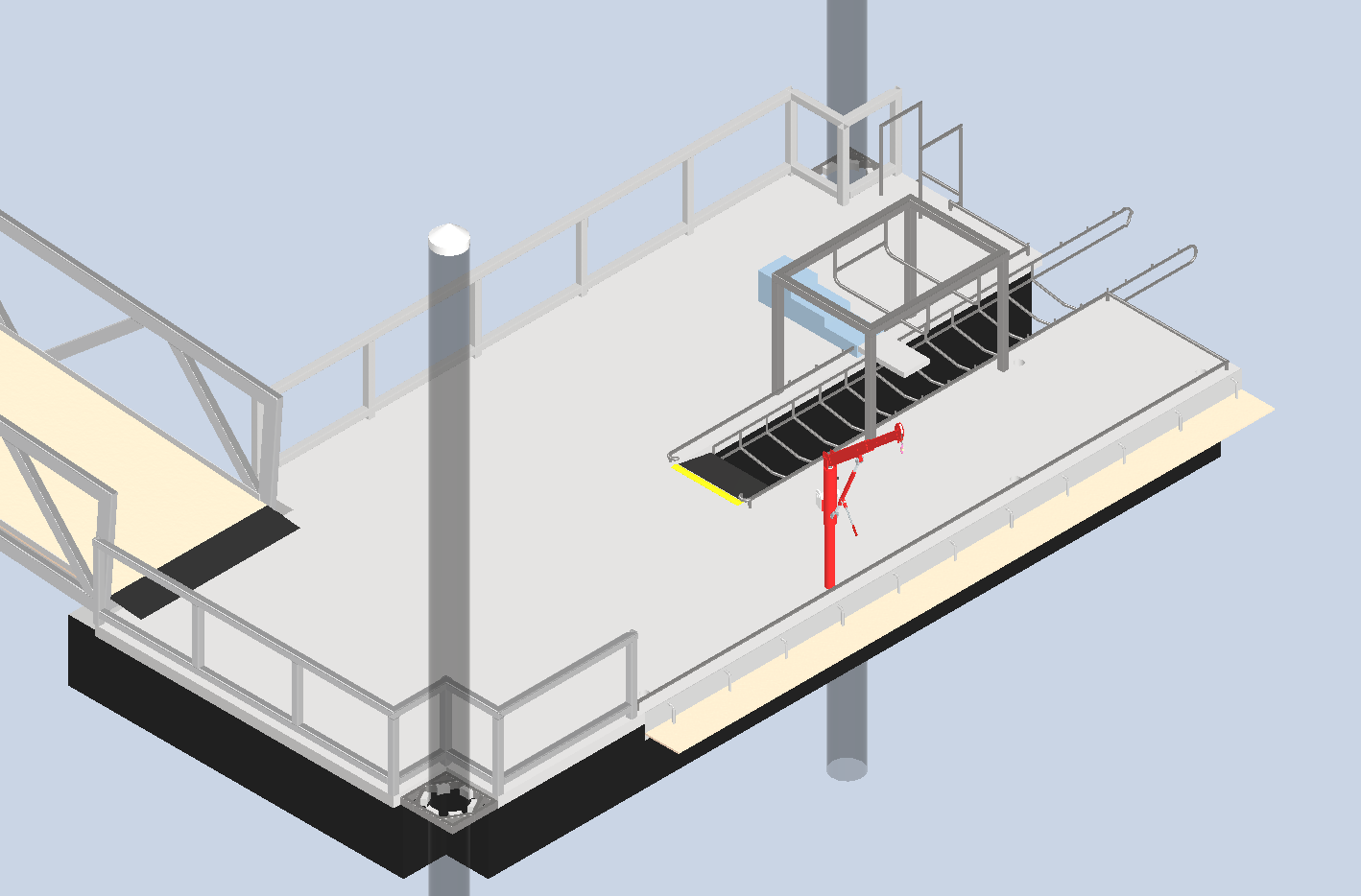 Once on the pontoon, kayaks would be placed in a specialised launcher. The launcher would incorporate design elements such as slide stops to allow people with a range of different abilities to manually enter and exit the launcher.