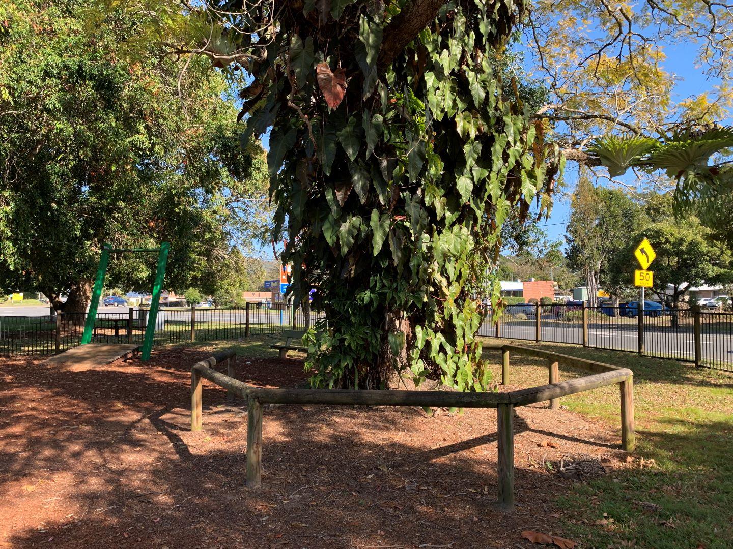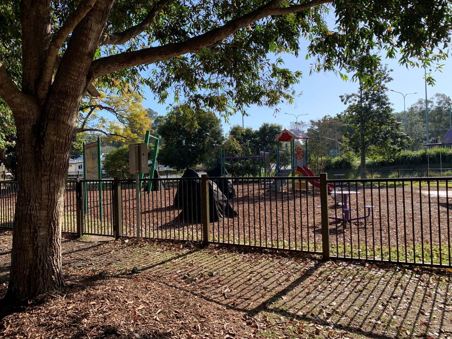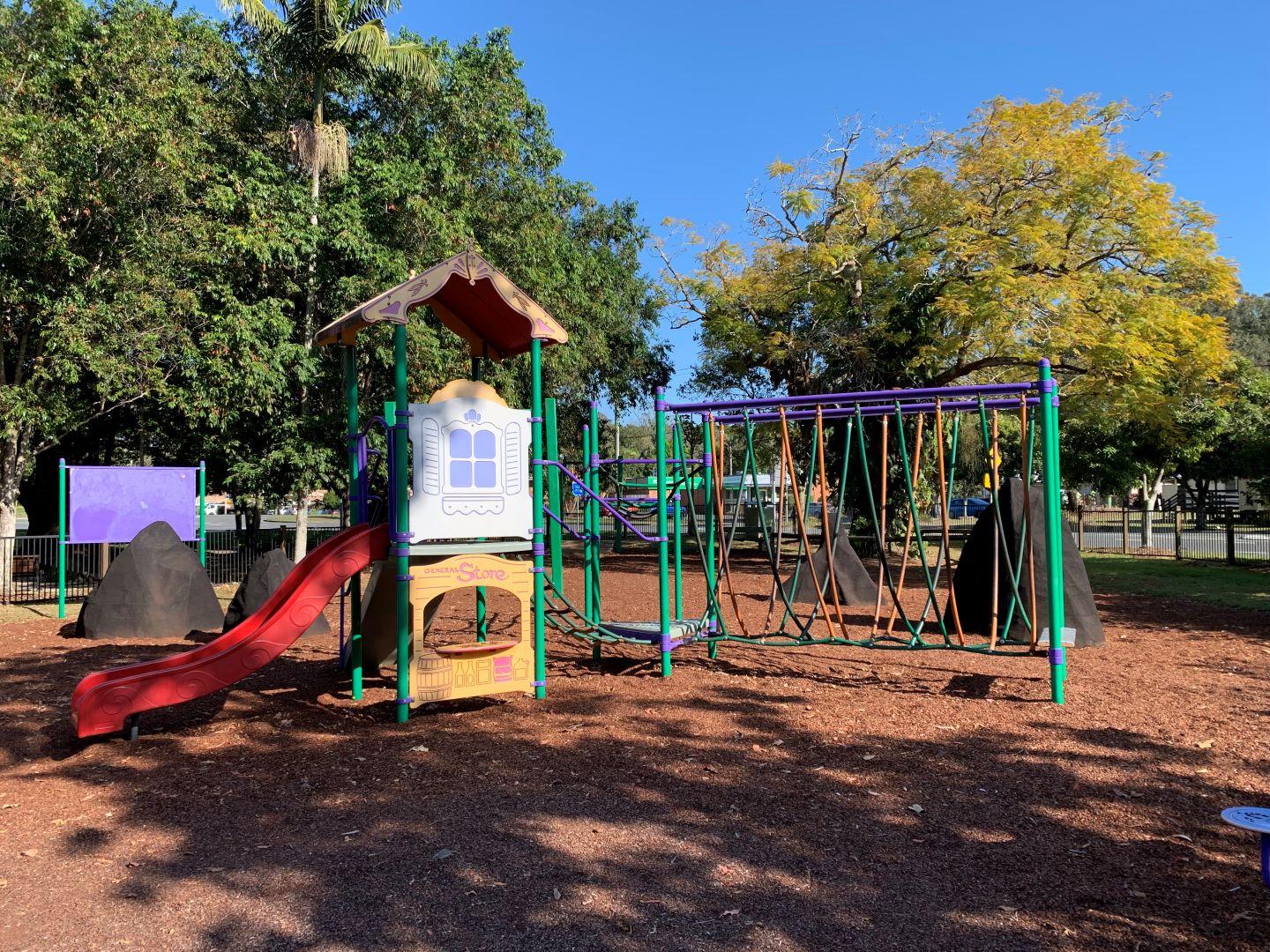 The park provides a fully fenced playground. The equipment includes a cable way (flying fox), several climbing rocks, a general store, rocking toys, slide and climbing bars plus some natural shade.