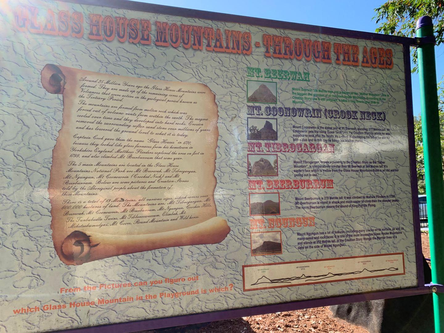 This park contains the Glass House Mountains Visitor and Interpretive Centre. There is a car park with room for coach parking. There is also a fully fenced playground and public amenities (access between set hours)