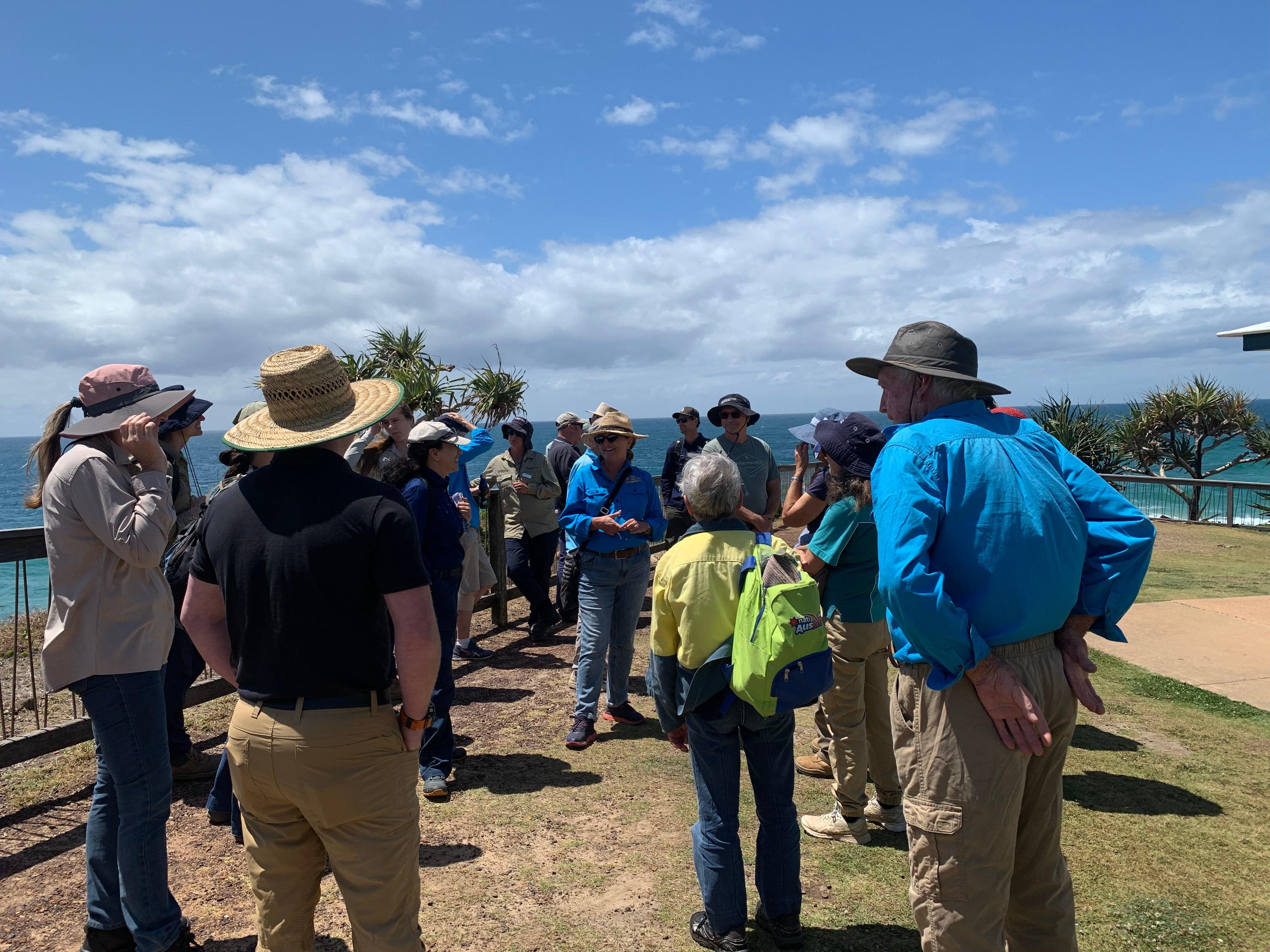In the year 2000, they undertook planting for a ‘2000 trees for the year 2000’ to revegetate the dunes and a watercourse in Coolum Beach. Linese and Birte (pictured) spoke to the tour attendees about outcomes they have achieved. Leigh, president of CaNSCC, (pictured at Point Arkwright) delivered an informative speech on the history and aims of CaNSCC.