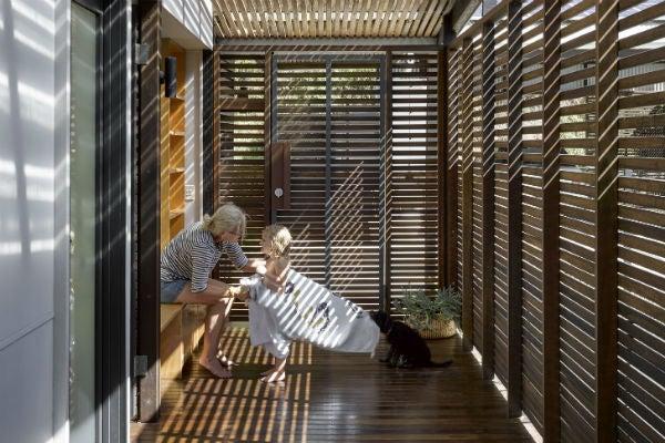 This single level house uses a lightweight steel structure and cantilevers over the site. The plan locates the bedrooms on one side and living areas on the other. A timber batten breezeway in the centre of the house channels breezes and connects indoor and outdoor spaces. The house has a raked ceiling with high-level windows and louvres that bring natural sunlight in a capture external views inside the house.