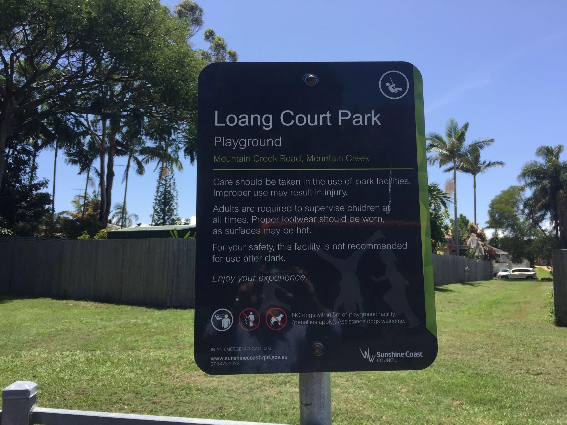 Loang Court Park is a simple park that provides a large open grassed area for informal sports, natural shade to one side and a playground that is fenced all round. The playground however sits behind thick vegetation, so visual surveillance from passers by may be infrequent