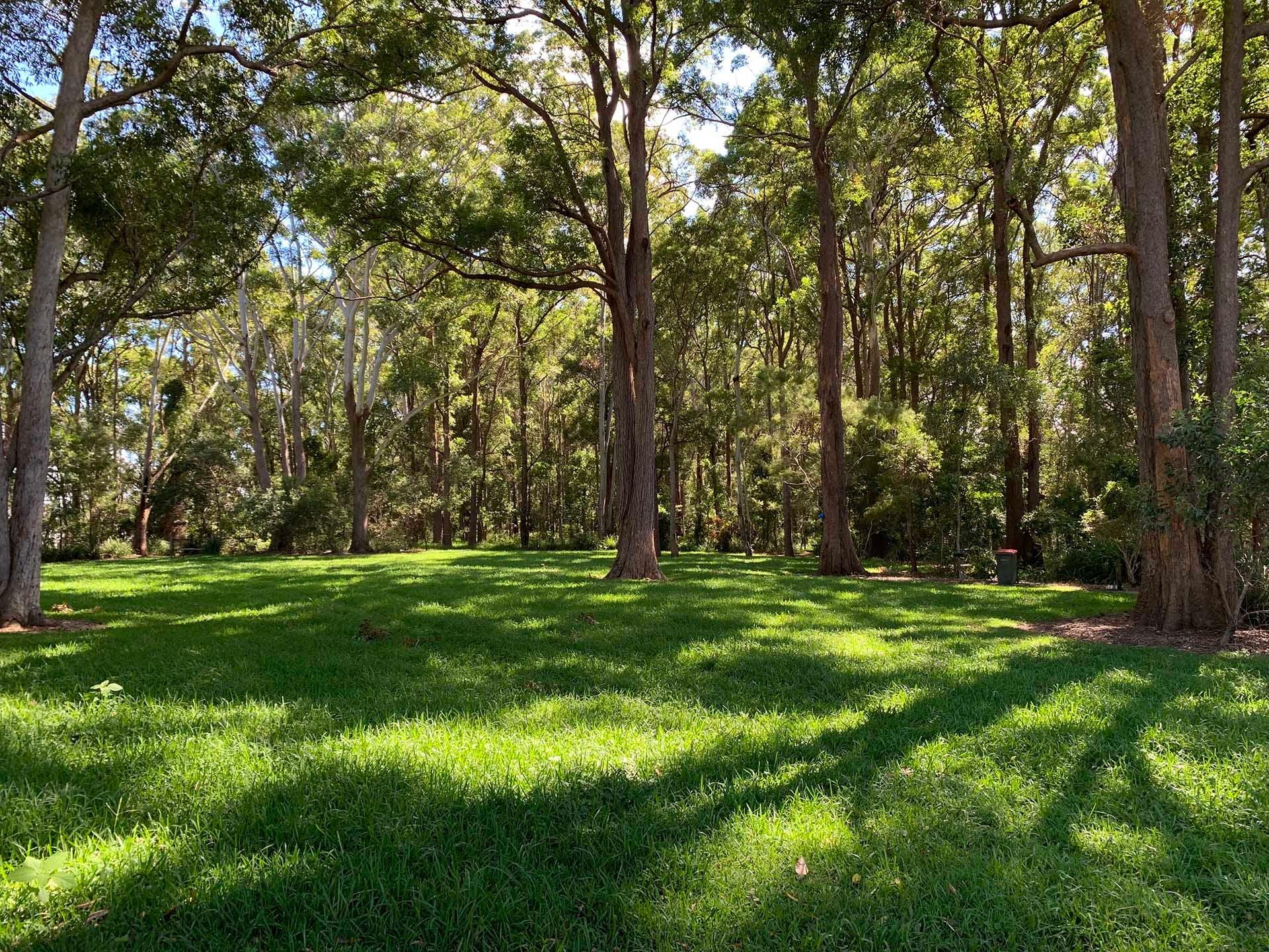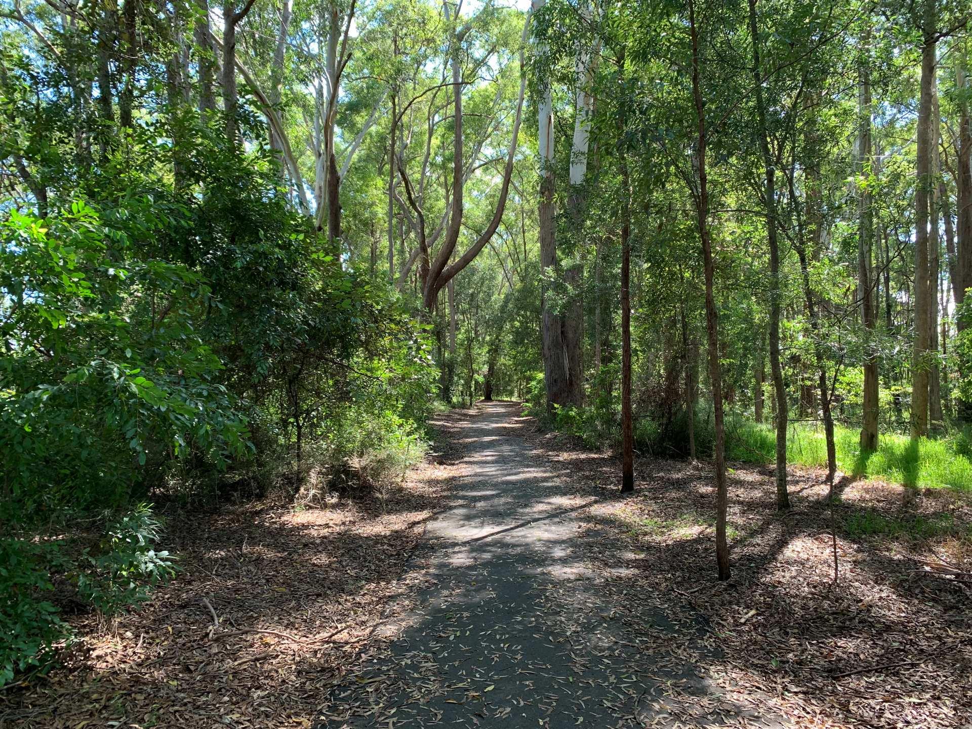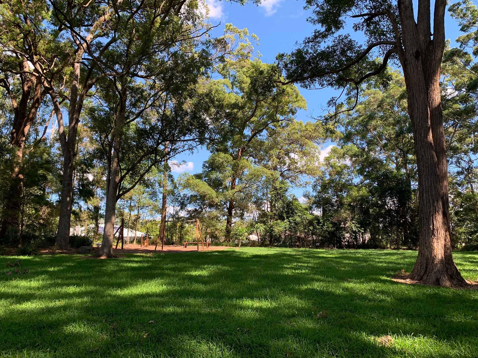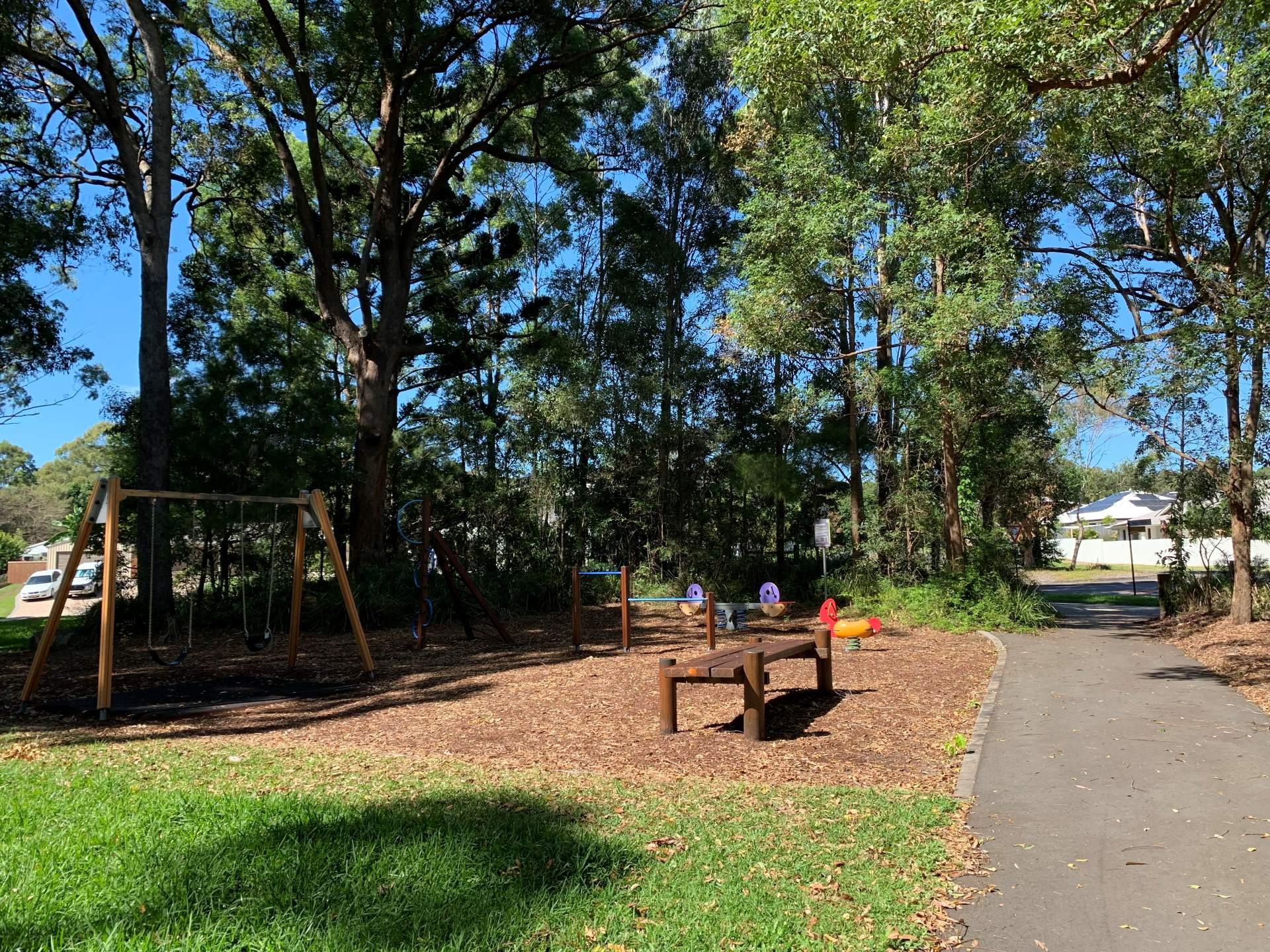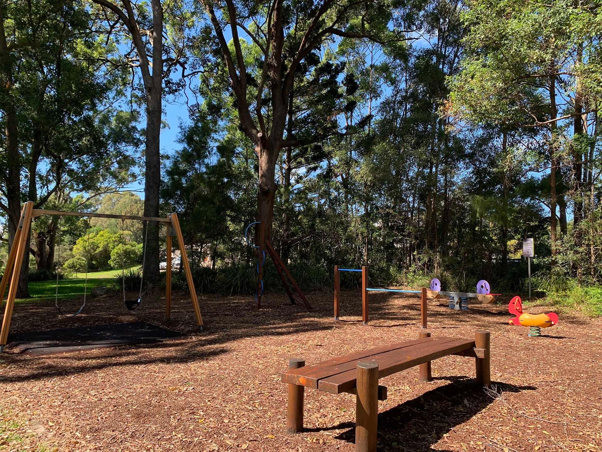 The playground is located in picturesque hilltop parkland on the corner of Tall Trees Way and Ivadale Boulevard. As the name suggests, this park is surrounded by 'tall trees' - beautiful remnant gums encasing a grassed open space. This area also has a barbecue and picnic tables. The environmental reserve has a 250 metre sealed pathway that starts from the north side of this parkland emerging near the north end of Tall Trees Way.