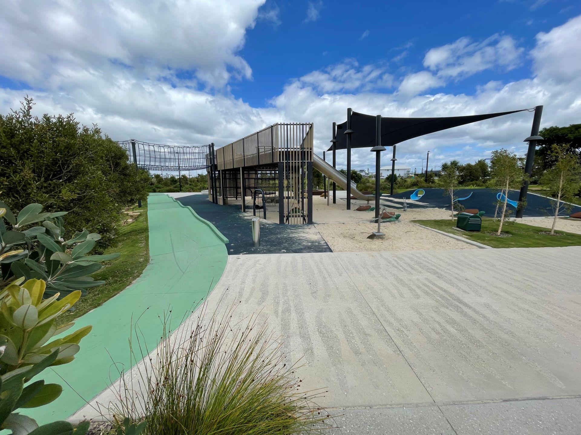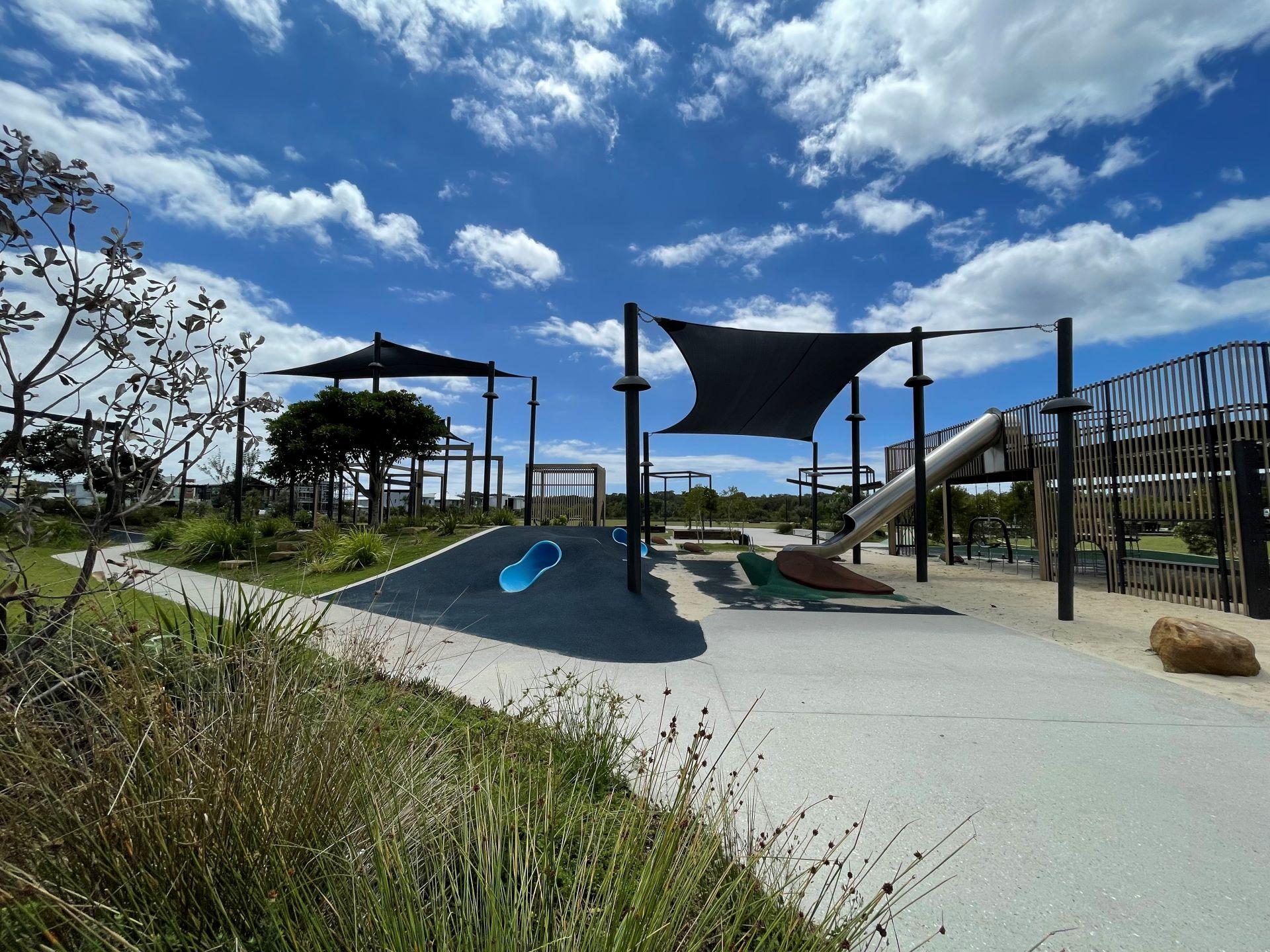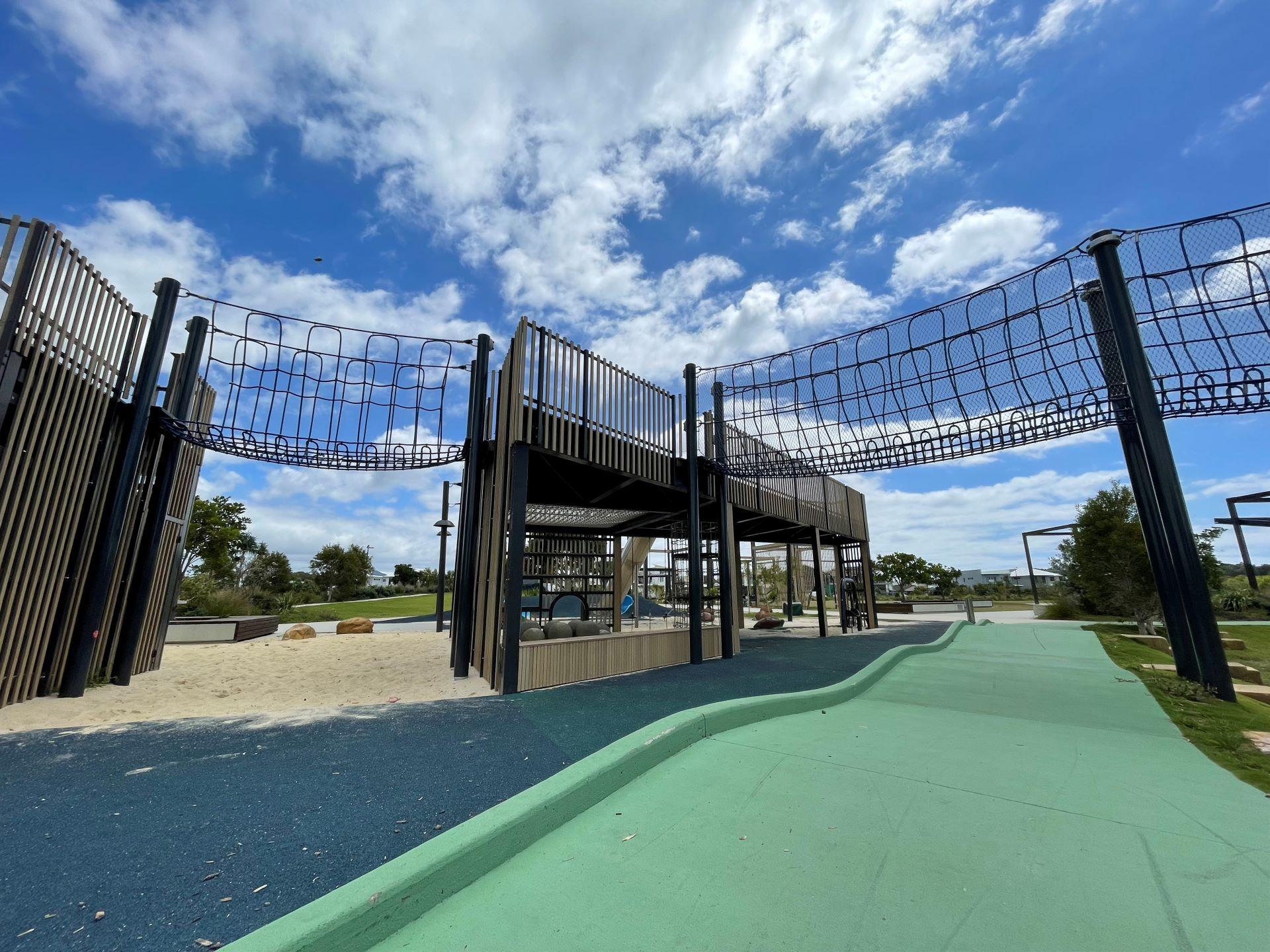 The Play space provides adventurous play elements such as climbing walls, slides and swings, as well as a large net connected by a rope bridge. Extending from the Plaza and the Playground areas is the parkland – an expansive green space with large boulders as well as shaded space suitable for a range of community activities from family picnics to social sporting matches. This area is also connected by and located adjacent to the coastal path. So you can access this park on your bikes or by foot.