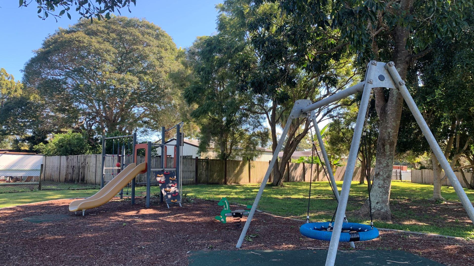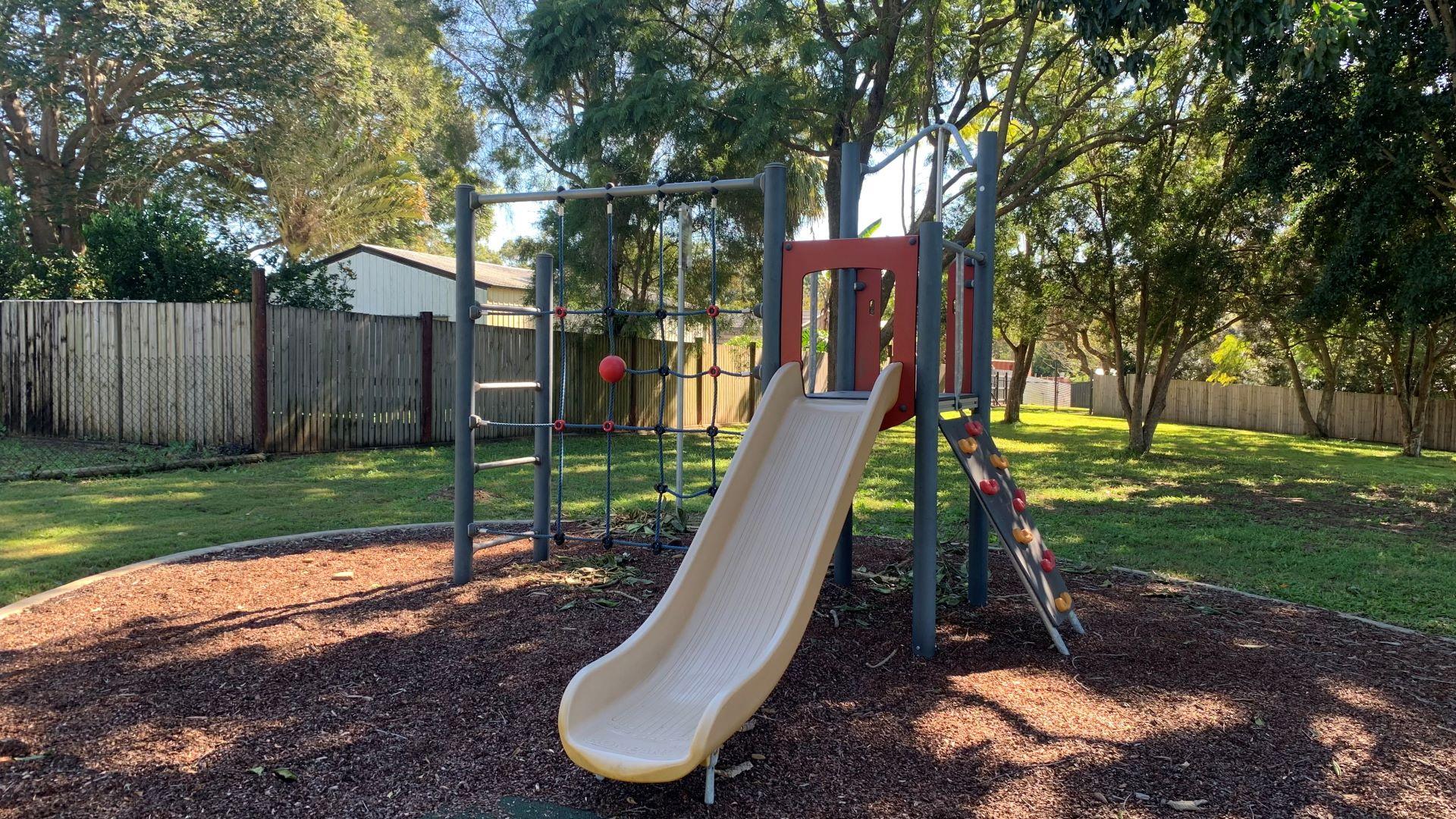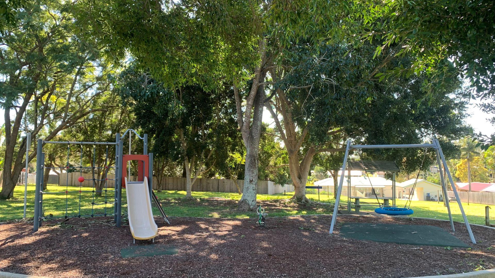 A quiet hidden park with a grass access between properties. This park provides a very large open space area for kick and throw activities, a shelter with picnic table and a playground under natural shade