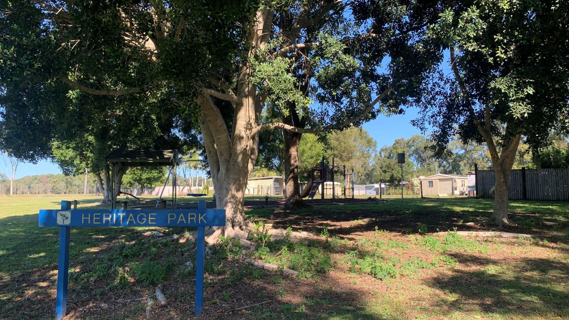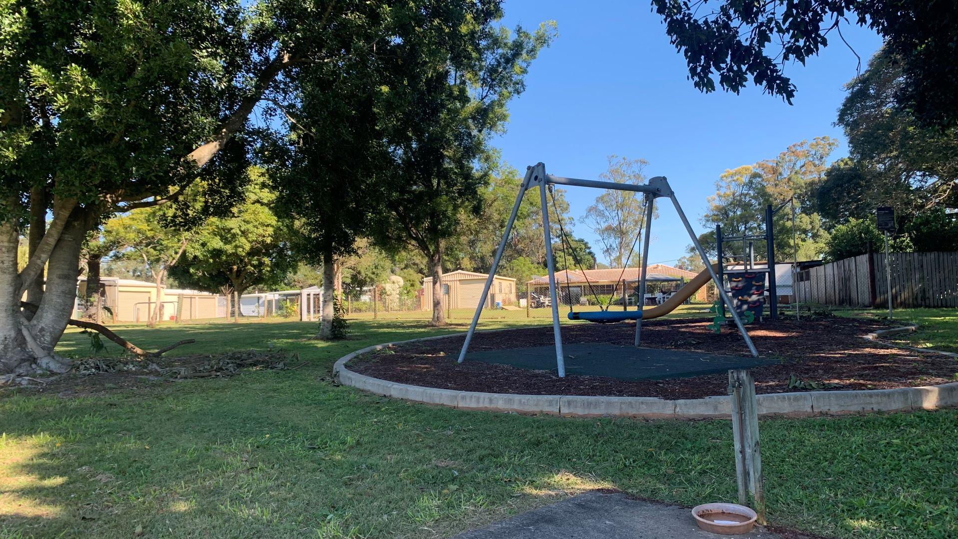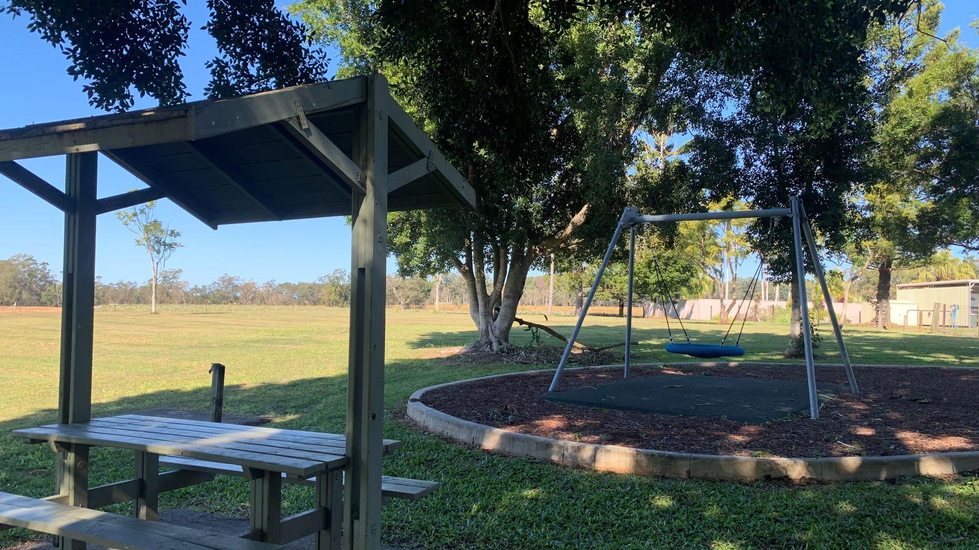 A quiet hidden park with a grass access between properties. This park provides a very large open space area for kick and throw activities, a shelter with picnic table and a playground under natural shade