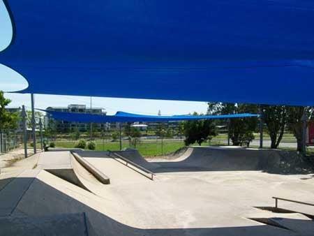 This skate facility is shaded by trees as well as shade sails, so it's great for all year round use. It features grind rails, two flat banks, declining ¼ bank, banked ½ pipe, grinding block spine, mini ¾ bowl, triple hump and ¼ pipe. Shade sails cover two thirds of the skate bowl.