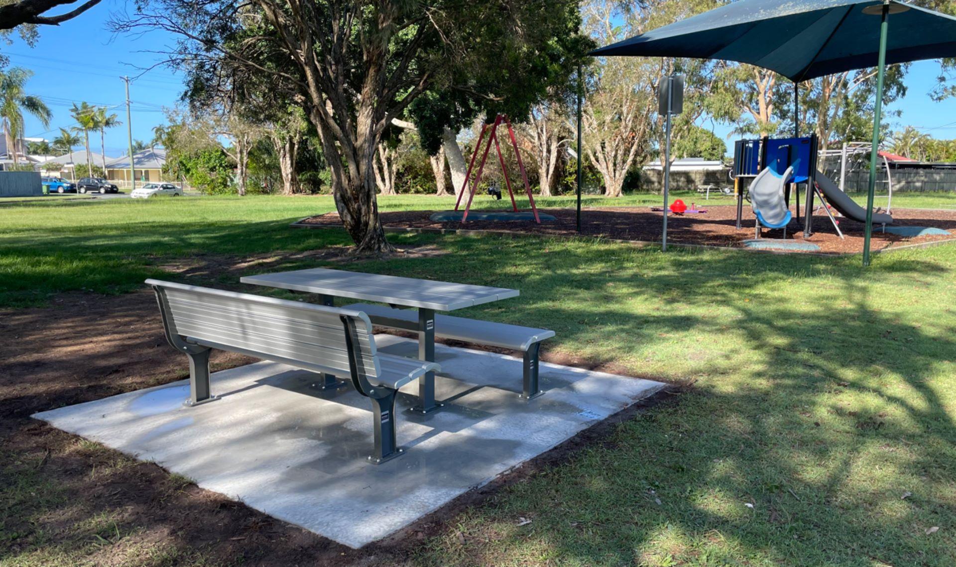 This park provides a large open grassed area for kick and throw activities, a shelter with picnic table, a playground under shade sails and an exercise equipment area under some natural shade for those who want to work out in the outdoors.